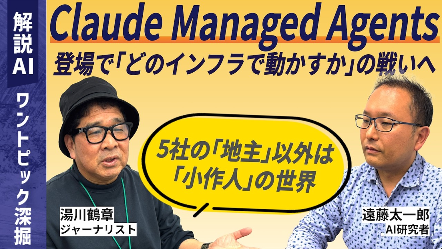 今回は、Anthropic社が新たに発表した「Claude Managed Agents」を見ながら、「『どのAIか』から『どのインフラで動かすか』へ」というテーマ深掘り解説していきます。 「エージェントを安全・安定的に動かすための土台づくりに数ヶ月かかるというのが業界の現実」 こうした課題を解決すべくAnthropicが提供を始めた新サービスは、実行インフラを丸ごと一括提供し、導入までの期間を「数ヶ月から数日」へと劇的に短縮させます。 Anthropic/OpenAI/Amazon/Microsoft/Googleによるインフラ競争が激化する中、「OpenClaw」をはじめとする「5社以外」はどうするのか。巨大プラットフォーマーという「地主」に対して、その他すべての企業がこの「小作人の世界」でどう戦うべきか、日本企業の勝ち筋も含め探ります。